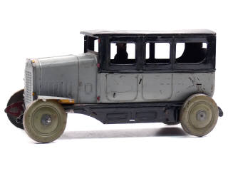 longueur 22 cm - fabrication de 1928 - avec chauffeur en tôle lithographiée - manque ailes, marchepieds, moteur à ressort & une agrafe de banquette - quelques petites déformations
