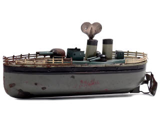 longueur 28 cm - moteur à clef (à revoir) - avec clef non d'origine - manque toit de cabine & mât avec son drapeau - traces d'oxydation - quelques déformations sur les rambardes - petits enfoncements sur la coque