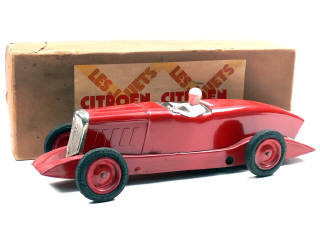 longueur 43 cm - moteur à clef (fonctionne) - avec direction & clef - pneus craquelés dont 2 légèrement affaissés - boîte avec pastille de couleur jaune - ETAT EXCEPTIONNEL POUR UN MODELE DE CETTE EPOQUE !