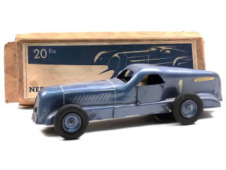 longueur 35 cm - moteur à clef (fonctionne) - version luxe avec capot à 10 ouies d'aération, socle, conducteur, portière ouvrante & phare électrique (ampoule à revoir) - petite étiquette d'origine 'LIVRE SANS PILE' collée sous le châssis - pneus séchés dont 2 légèrement déformés - TRES BEL ASPECT GENERAL POUR UN MODELE DE CETTE EPOQUE !
