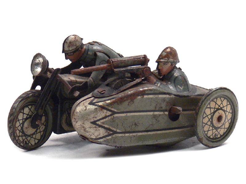 longueur 10 cm - moteur à clef (à revoir) - mitrailleuse avec système de pierre à briquet - fourche de la moto légèrement tordue - traces d'oxydation & déformation de la partie inférieure du side-car causée par le ressort