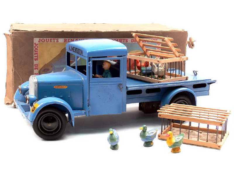 longueur 42,5 cm - moteur à clef (fonctionne) - avec 2 cages en bois contenant 4 canards (une tête manquante & socle de cage décollé) & 4 poules - manque chaînette avec ressort de maintien - inscriptions au pochoir 'ALIMENTATION' sur le fronton de cabine, 'TD' sur l'aile avant gauche & '396 - 25 - CIJ' à l'arrière - version avec phares électrifiés (à revoir) - avec étiquette collée sur le châssis 'LIVRE SANS PILE', conducteur & notice collée sous le couvercle de boîte - volant non d'origine - traces d'oxydation sur le moteur & les axes de roues - chargement & boîte de la référence 6/25 (camion coquetier) - TRES BEL ASPECT GENERAL POUR UN MODELE DE CETTE EPOQUE !