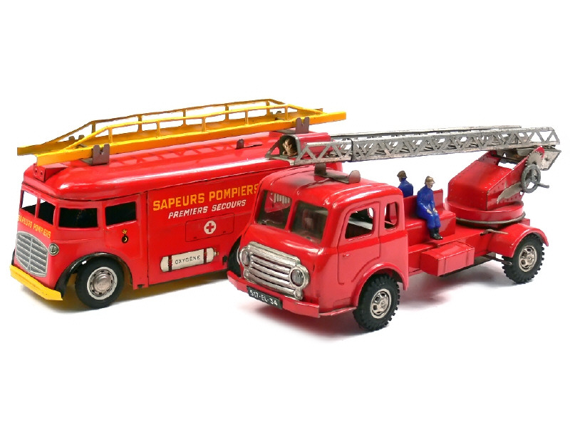 longueur 33 cm - moteur à clef (fonctionne) - avec nacelle & 2 pompiers - légères traces d'oxydation sur l'échelle - système d'élévation à revoir - manque ficelle d'extension