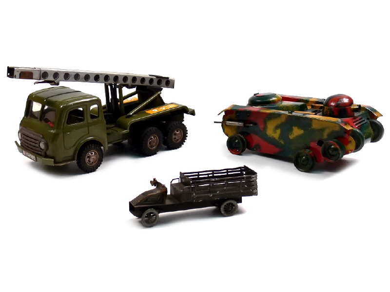 longueur 25,5 cm - moteur à friction (fonctionne) - manque chenilles, outils amovibles avec 2 fixations & canons de tourelle arrière - quelques déformations - système de pierre à briquet à revoir - on y joint un camion RENAULT plateau à clairvoies de marque indéterminée en état 'D' avec quelques déformations