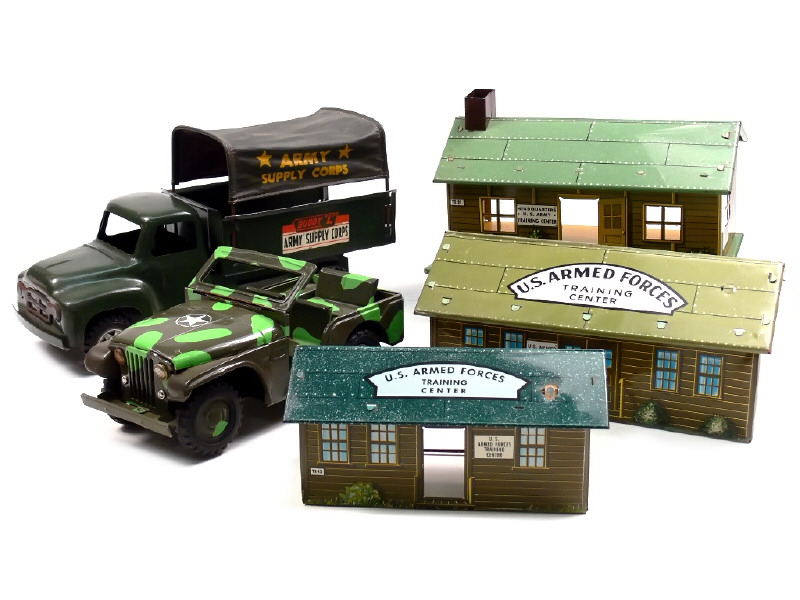 états de 'B' à 'D' - comprend : un camion bâché 'ARMY SUPPLY CORPS', une JEEP en tôle lithographiée (axe & roues arrière non d'origine, manque volant), 2 bâtiments 'US ARMED FORCES TRAINING CENTER' (modèles de tailles différentes) & un bâtiment 'HEADQUARTER US ARMY TRAINING CENTER' en tôle lithographiée (manque une cheminée) - quelques traces d'oxydation - on y retrouve les marques : MARX, BUDDY L & CRAGSTAN