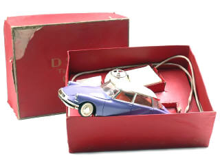longueur 27 cm - moteur à pile & phares électriques (fonctionnent) - direction à revoir - avec notice - ce modèle ayant certainement séjourné pendant plusieurs années dans son coffret, le fil de la commande a provoqué une réaction chimique (trace de fonte) sur le toit - ce type d'incident est bien connu sur les modèles filoguidés de cette marque - très légères déformations de la carrosserie