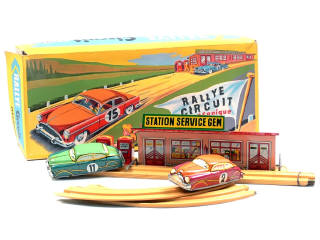 dimensions du coffret : 38,5 x 16 cm - comprend : une station-service avec piste, 2 voitures (moteurs à clef fonctionnent), 3 rails droits, 3 rails courbes, 2 clefs (oxydées) & un panonceau de toit - avec cale de boîte