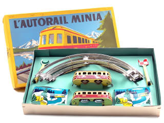 JOUSTRA (FRANCE) 808 Coffret autorail 'MINIA' en tôle lithographiée jaune pâle & grenat