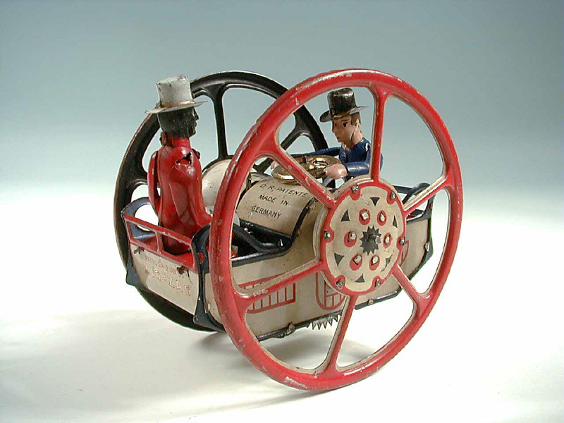 diamètre 13 cm - fabriqué de 1910 à 1945 - moteur à ressort (fonctionne) - en action, le véhicule avance en zigzaguant & en se balançant - les personnage basculent en tenant les volant & levier - SUPERBE !