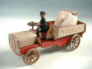 longueur 16 cm - fabriqué de 1907 à 1935 - moteur à ressort (fonctionne) - en action, le véhicule avance en cercles - on y joint deux sacs lestés en toile - SUPERBE !