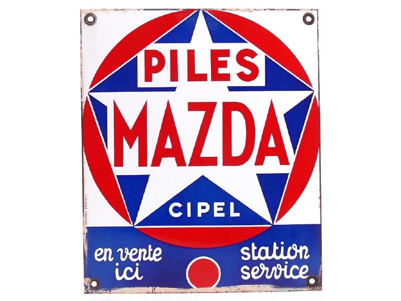 VITRACIER NEUHAUS (FRANCE) Plaque émaillée 'PILES MAZDA' bleu, blanc & rouge