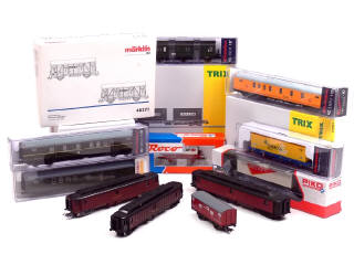 on y retrouve notamment les marques PIKO, HORNBY, ROCO,TRIX, ELECTROTREN, MÄRKLIN & JOUEF - 4 wagons sans boîte en état 'B' dont un avec parties métalliques oxydées & un autre avec un attelage manquant