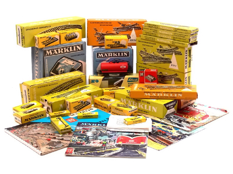 comprend : 2 boîtes de 10 rails droits (référence 5106), 2 boîtes de 10 rails courbes (5100), 2 boîtes de 10 rails courbes (5120), 2 boîtes de 2 aiguillages (5121), une boîte de 2 aiguillages (5117), un croisement (5207), 3 boîtes de rails d'alimentation (5111), une boîte de rails courbes d'alimentation (5103), 2 boîtes de 2 aiguillages (5202), 3 boîtes de commande à distance (7072), 3 boîtes de heurtoirs (7190), 2 boîtes de heurtoirs avec signaux (7191), un élément de voie dételeur (5112), 3 boîtes de distributeurs (7069), un tableau de commande (7071), un signal de voies (5113) & 2 transformateurs (6015 & 6115) - on y joint une bobine de fil électrique HORNBY HO, un tableau d'éclairage de la marque JOUEF, un wagon-citerne de nettoyage de voies 'GASOLIN' de la marque LILIPUT & 4 catalogues des marques MÄRKLIN & MECCANO - quelques boîtes en état 'c'