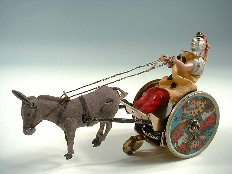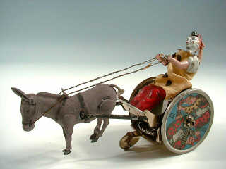 longueur 19 cm - fabriqué de 1897 à 1938 - mécanisme à ressort (fonctionne) - en action, la charette avance & recule, pendant que le clown bascule & tire sur les rênes en faisant faire des ruades à la mule - les parties textiles sont en excellent état - les lithographies des roues & du caisson arrière sont superbes - IRRESISTIBLE !