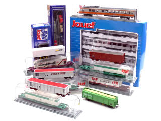 JOUEF 'HO' (FRANCE) Ensemble de 5 voitures de voyageurs, 13 wagons de marchandises & des petits accessoires