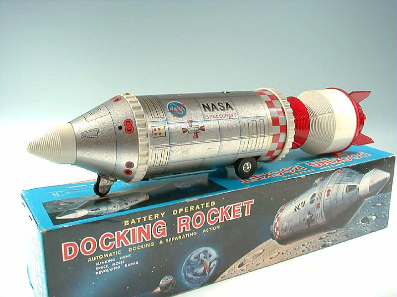 longueur 42 cm - mécanisme à piles (fonctionne) - en action, la fusée avance avec bruitage & lampe clignotante, puis largue le réacteur - en fin de course, cet élément rejoint le corps principal - manque un radar