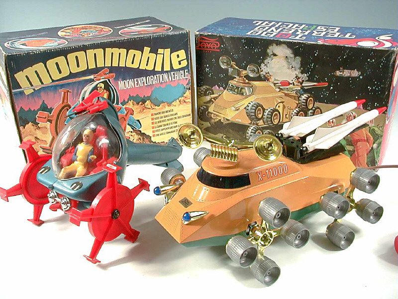 longueur 33 cm - moteur à piles filoguidé (fonctionne) - l'engin avance & recule, vire à droite ou à gauche - les phares bleus clignotent - éjection des missiles par poussoir