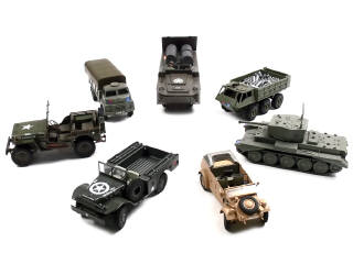 comprend : un char, un DUKW amphibie, une JEEP, un BEDFORD bâché (bâche repeinte), une KUBELWAGEN, un DODGE 4x4 & un ALVIS amphibie - 2 modèles transformés & repeints - on y retrouve notamment les marques : AIRFIX, GONIO & GATE