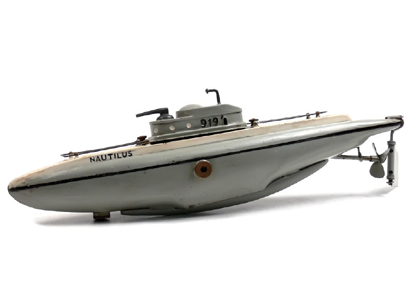 ce modèle de 42 cm de long est inspiré du célèbre NAUTILUS américain & est animé par un moteur à ressort puissant - moteur à clef (fonctionne partiellement avec ressort cassé) - manque gouverne arrière de profondeur & joint d'étanchéité du kiosque - traces d'oxydation à l'intérieur de la coque & sur le moteur - petites retouches