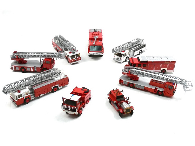 miniatures reproduisant les modèles : RENAULT, E-ONE, SIDES & DENNIS - on y retrouve notamment les marques : CEF REPLEX, CONRAD & CORGI TOYS - un véhicule en état 'C' - quelques petits manques