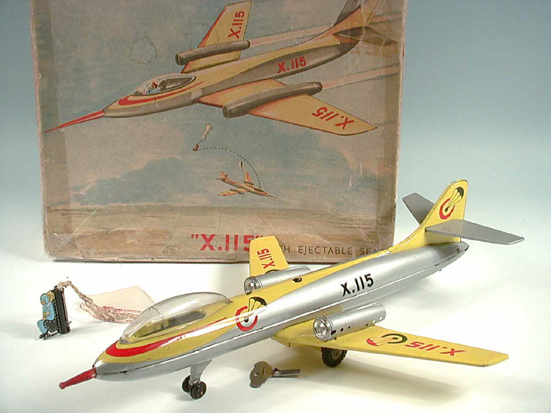 longueur 43 cm - moteur à clef (poussif) - pilote en tôle lithographiée avec son parachute - clef & cockpit