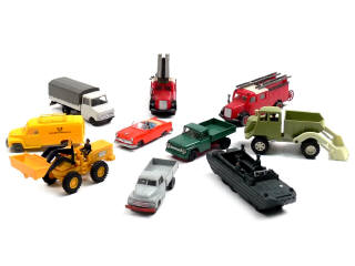 états de 'A' à 'C' - réalisation en plastique (un camion en métal) - miniatures reproduisant notamment les modèles : FORD, OPEL, HATRA, DUCK & MERCEDES-BENZ - 2 modèles avec parties repeintes & 2 autres avec détails de peinture ajoutés - traces d'oxydation sur quelques axes de roues