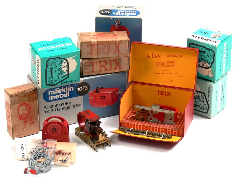 comprend : 5 modèles de la marque MÄRKLIN (3 référence 1071 & 2 autres référence 1073) & 4 de la marque TRIX (un référence 2051 avec chaînette & élastique de transmission & 3 autres référence 2055 en état 'D' avec boîte 'c')