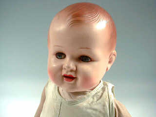 yeux riboulants bleus, bouche ouverte sur deux dents, corps en chiffon, mains en plastique - hauteur 50 cm - années 1940