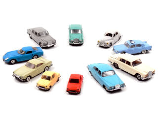 états de 'B' à 'C' - miniatures reproduisant les modèles : ROLLS ROYCE, PEUGEOT, JAGUAR, VOLVO, FERRARI & VESPA - carrosseries légèrement déformées - pellicule chromée des pare-chocs en grande partie effacée sur quelques voitures - avec manques - présence de petites fêlures