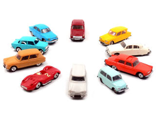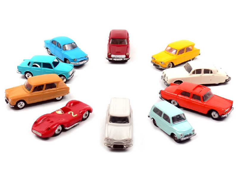 états de 'B' à 'C' - miniatures reproduisant les modèles : MASERATI, FIAT, CITROËN, PEUGEOT, LANCIA, PANHARD & JAGUAR - quelques carrosseries légèrement déformées - pellicule chromée des pare-chocs en grande partie effacée sur certaines voitures - avec manques - jantes fondues sur 2 véhicules - présence de petites fêlures