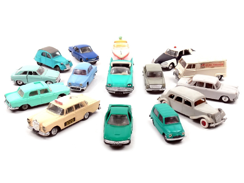 états de 'B' à 'D' - miniatures reproduisant les modèles : ALFA ROMEO, AUSTIN, CHRYSLER, CITROËN (une voiture avec jantes légèrement déformées), FIAT, LANCIA, MERCEDES, PEUGEOT (un véhicule avec jantes légèrement déformées), RENAULT & SIMCA - petits manques - légères déformations de quelques carrosseries