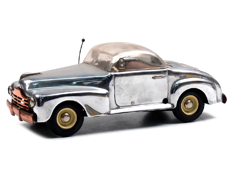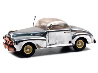 longueur 26,5 cm - moteur à clef (fonctionne) - avec coffre ouvrant contenant 2 jerrycans - système de boîte à musique (à revoir) - 2 petites fêlures autour d'une fixation de toit - chromes très légèrement piqués - SUPERBE !