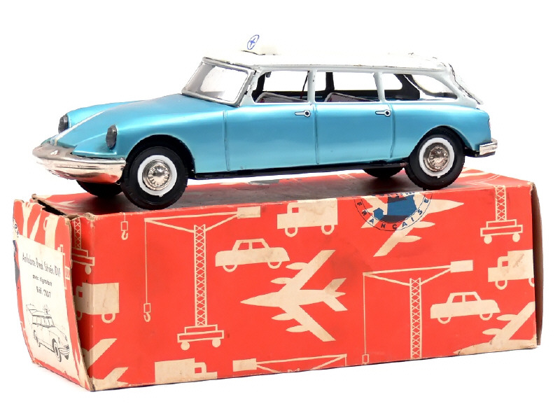 longueur 21 cm - moteur à friction (à revoir) - avec panonceau de toit électrique (fonctionne) - roues avant bloquées - petites traces d'oxydation