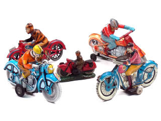 L Moto en tôle lithographiée bleu, orange & jaune