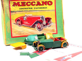 dimensions du coffret : 39 x 30 cm - moteur à clef (fonctionne) - avec direction, frein, 5 éléments supplémentaires permettant de transformer la voiture en coupé, en roadster ou en voiture de course, une clef de remontage de moteur (non d'origine), une publicité permettant de s'abonner à la revue 'MECCANO MAGAZINE' & carton de fond de boîte - caoutchouc des pneus séché - petites traces d'oxydations - TRES BEL ASPECT GENERAL POUR UN MODELE CE CETTE EPOQUE !