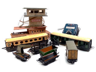 comprend : 6 wagons, une voiture de voyageurs, un transformateur & une gare - on y joint un poste d'aiguillage en bois de marque indéterminée