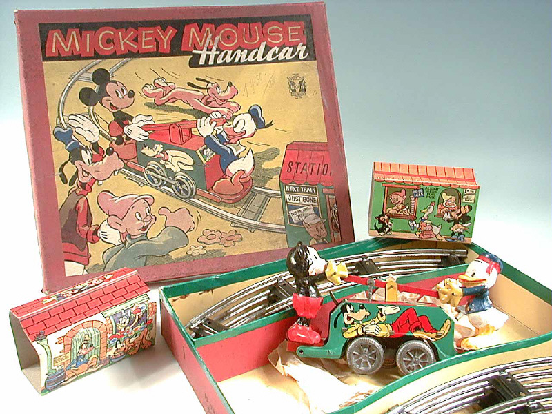 dimensions de la boîte 30 x 34 cm - comprend une draisine en tôle lithographiée actionnée par Mickey & Donald - figurines en composition - moteur à clef (fonctionne) - deux gares en carton illustré - 6 rails courbes - SUPERBE !