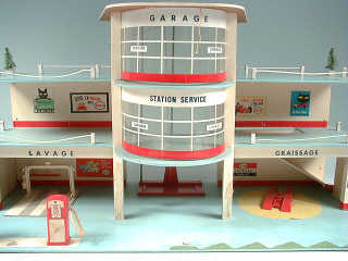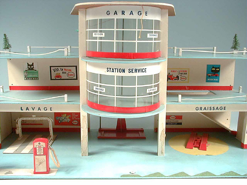 dimensions : 33 x 33 x 67 cm - avec publicités MARCHAL - pompes à essence, station de lavage & graissage & ascenseur