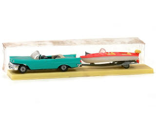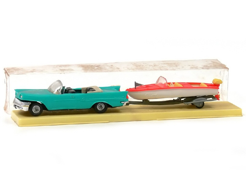 NOREV (FRANCE) 92 CHRYSLER NEW YORKER avec DINGHY ROCCA sur remorque vert turquoise, blanc & rose fluo