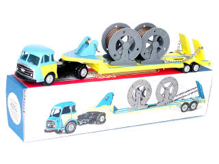 C.I.J./NOREV (FRANCE) 4/75/00 SOMUA Semi-remorque surbaissée porte-bobines de câbles bleu, jaune & noir