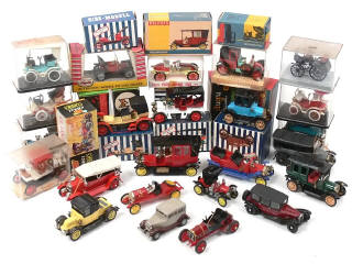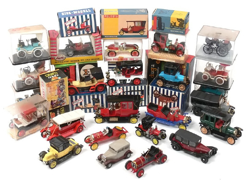 état de 'A' à 'D' - miniatures reproduisant notamment les modèles : RENAULT, FORD, PACKARD, PEUGEOT, DELAHAYE, LE ZEBRE, LANCIA, ISOTTA FRASCHINI, FIAT, BENZ, N.A.G., OPEL, MERCEDES, ITALA & ALFA ROMEO - on y retrouve les marques : WIKING, DUGU, ZISS-MODELL, SAFIR, MINIALUXE, CORGI CLASSICS, ANGUPLAS & POLITOYS - un véhicule sans boîte - 2 voitures avec importantes traces de métal fatigue & une autre avec traces d'humidité sur les accessoires - petits manques