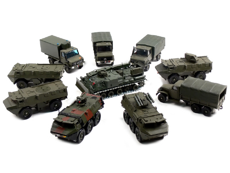 miniatures reproduisant les modèles : AMX, GMC, MERCEDES (dont un véhicule transformé) & SAVIEM (un exemplaire repeint) - quelques petits détails de peinture & décalques ajoutés - manque accessoires