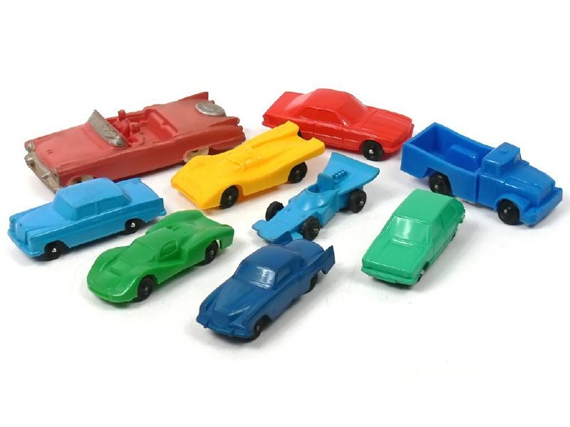 réalisation en caoutchouc - miniatures reproduisant notamment les modèles : CADILLAC, MERCEDES, VOLKSWAGEN, STUDEBAKER, PORSCHE & SCAMMELL - on y retrouve notamment les marques : AUBURN, GALANITE, ALBA & RESTUCCIA - un véhicule en état 'D' avec axes de roues oxydés & décoloration de la carrosserie & 2 autres avec un axe de roues coupé