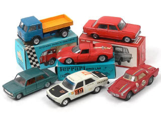 états de 'A' à 'B' - miniatures reproduisant les modèles : MASERATI, FERRARI, FIAT, PEUGEOT & LANCIA - on y retrouve les marques : MERCURY, MEBETOYS, BUBY & PENNY - 3 véhicules avec boîte & un autre avec quelques petits manques sur les décalques