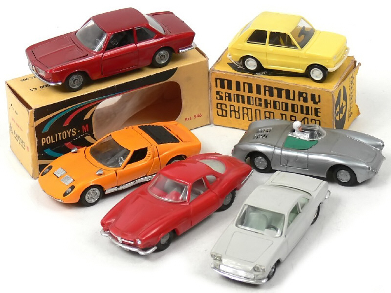 états de 'A' à 'B' - miniatures reproduisant les modèles : FIAT, ALFA ROMEO, LAMBORGHINI, PORSCHE & BMW - on y retrouve les marques : POLITOYS & ESTETYKA - 2 modèles avec boîte & un autre avec un phare scintillant manquant