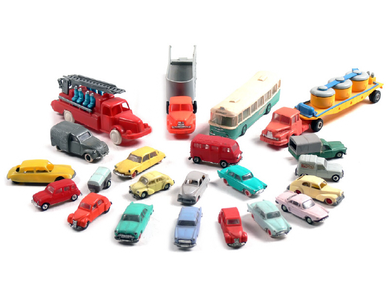 états de 'B' à 'D' - miniatures reproduisant les modèles : SIMCA, RENAULT, PEUGEOT, CITROËN, CHAUSSON, BERLIET & UNIC - on y retrouve les marques : CLE, NOREV, JOUEF, ANGUPLAS (carrosserie déformée), BS & CADUM PAX - quelques manques & parties cassées