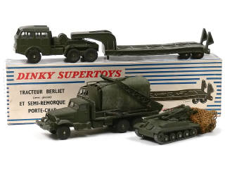 DINKY TOYS (FRANCE) 890 BERLIET Transport de char (version avec jantes du tracteur & de la remorque concaves) kaki
