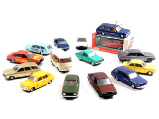 miniatures reproduisant les modèles : RENAULT (un exemplaire en boîte état 'b'), PEUGEOT, TALBOT, SIMCA, FORD & ALPINE - jantes fondues sur 3 voitures - carrosseries légèrement encrassées