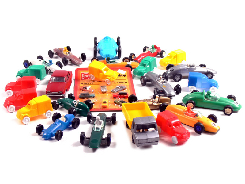 miniatures reproduisant notamment les modèles : PORSCHE, FERRARI, COOPER, FORD, CITROËN, BERLIET, CHEVROLET, FERGUSON, CADILLAC, OPEL & LOTUS - on y retrouve notamment les marques : BUSCH (8 voitures sous blister jamais ouvert), POLITOYS (promotionnel SKIP), CLE (un exemplaire promotionnel JACQUET avec trace de ruban adhésif sur la carrosserie) & INGAP