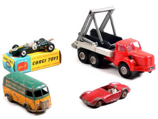 états de 'B' à 'E' - miniatures reproduisant les modèles : BERLIET, LOTUS (en boîte état 'b'), MASERATI & PEUGEOT - on y retrouve les marques : NOREV, DINKY TOYS FRANCE & CORGI TOYS - avec manques